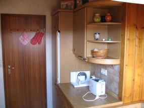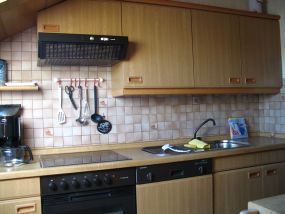 Schlafzimmer mit Doppelbetten, sowie eine komplett eingerichtete Küche mit